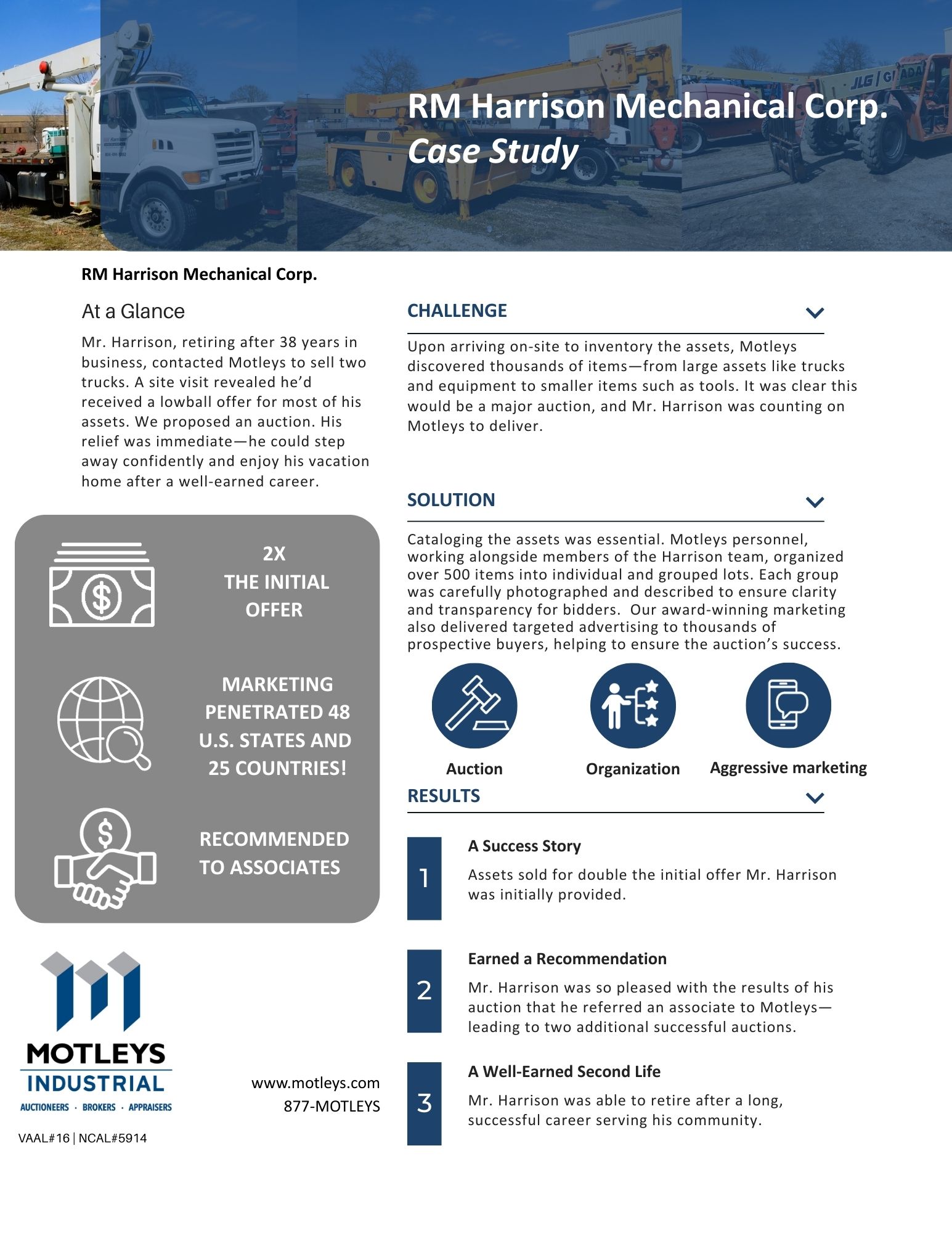 RM Harrison Mr. Harrison, retiring after 38 years in business, contacted Motleys to sell two trucks. Click image to read more. | State Fairgrounds of Virginia State Fairgrounds of Virginia was in default. Click image to read more. | RS Harritan & Co. RS Harritan & Co. liquidated manufacturing assets. Click image to read more. |